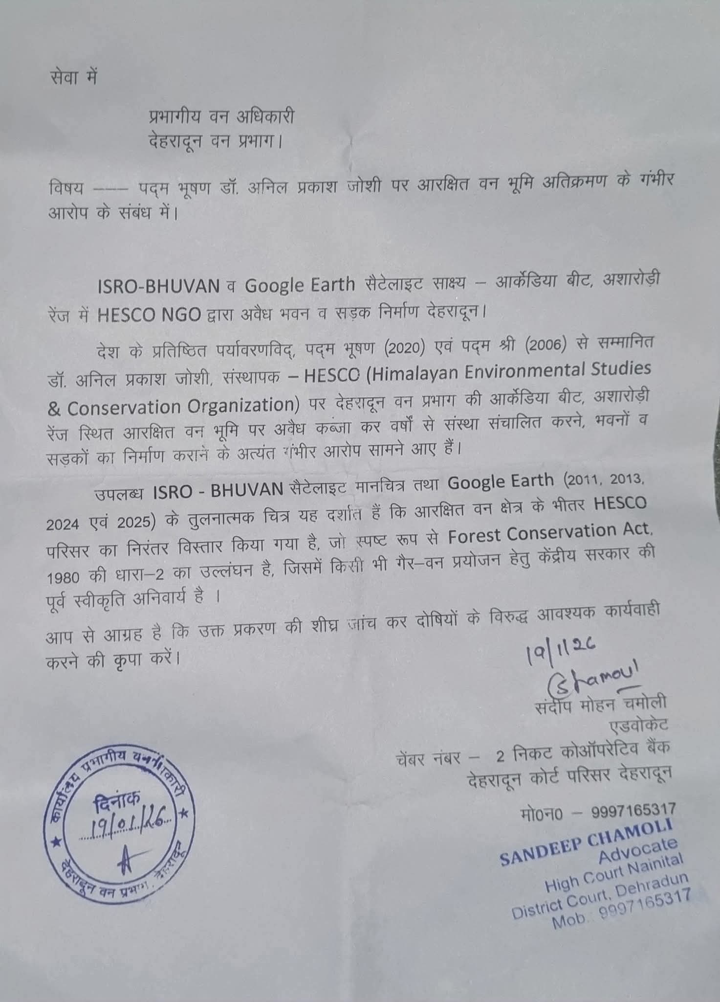 देश के प्रतिष्ठित पर्यावरणविद्, पद्म भूषण (2020) एवं पद्मश्री (2006) से सम्मानित डॉ. अनिल प्रकाश जोशी, संस्थापक – HESCO (Himalayan Environmental Studies & Conservation Organization) पर देहरादून वन प्रभाग की आर्केडिया बीट,अशारोड़ी रेंज स्थित आरक्षित वन भूमि पर अवैध कब्ज़ा कर वर्षों से संस्था संचालित करने, भवनों व सड़कों का निर्माण कराने के अत्यंत गंभीर आरोप लगाए गए हैं।संदीप चमोली द्वारा बताया गया कि ISRO-BHUVAN सैटेलाइट मानचित्र तथा Google Earth (2011, 2013, 2024 एवं 2025) के तुलनात्मक चित्र यह दर्शाते हैं कि आरक्षित वन क्षेत्र के भीतर HESCO परिसर का निरंतर विस्तार किया गया है, जो स्पष्ट रूप से Forest Conservation Act, 1927 का उल्लंघन है ।